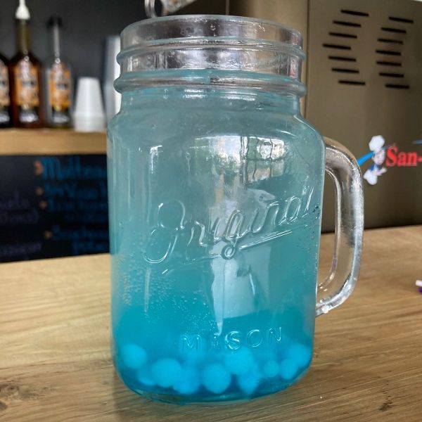 Hielo, agua, azúcar, escencia de mora azul y frutas secas