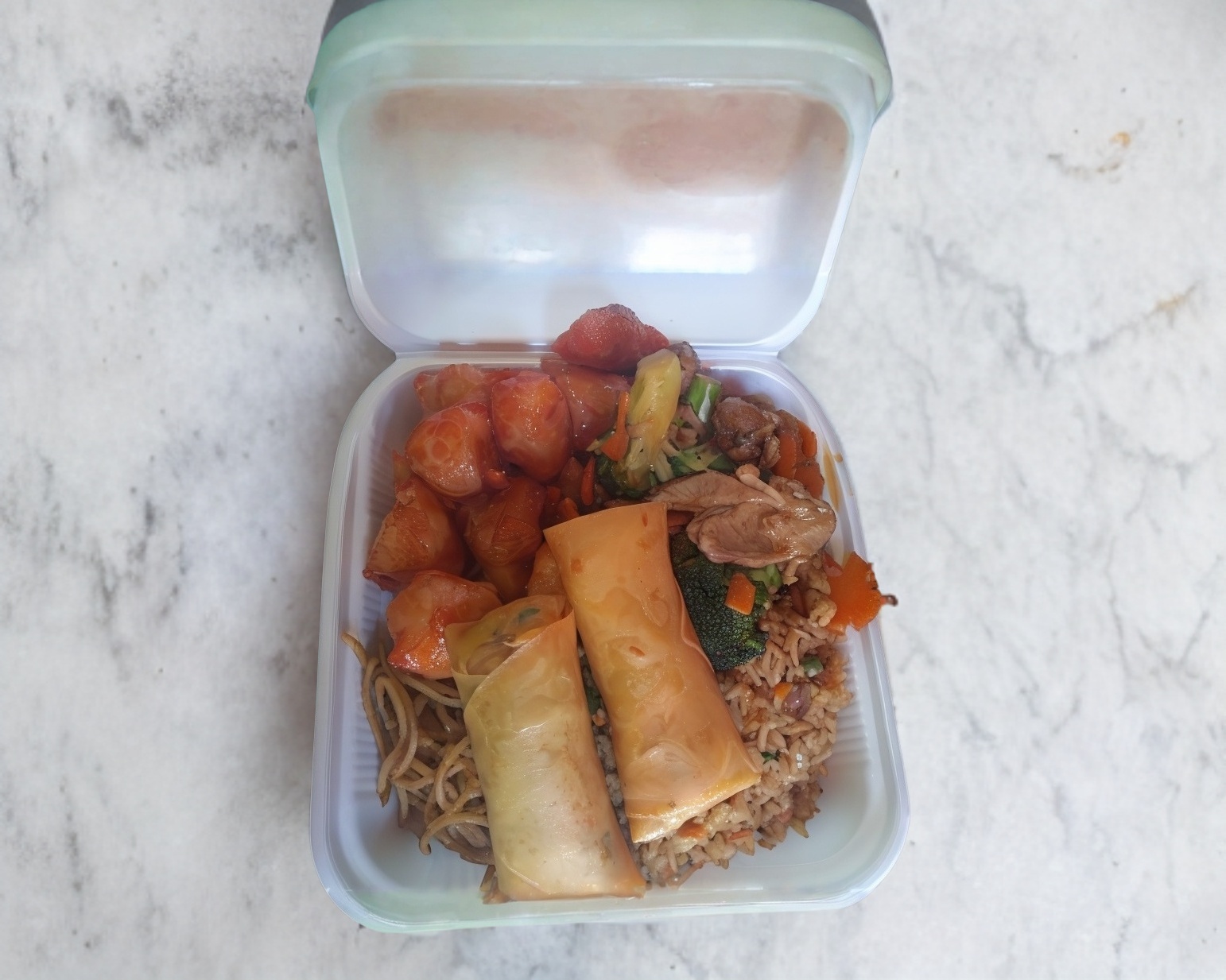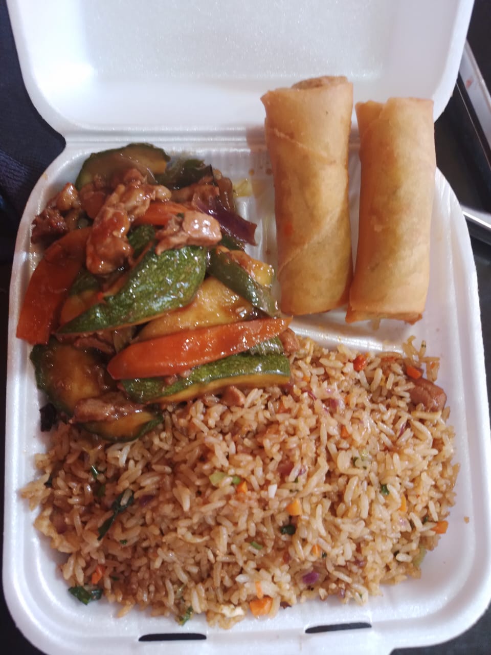 Pollo agridulce y bistec de res con brocoli y rollo primavera