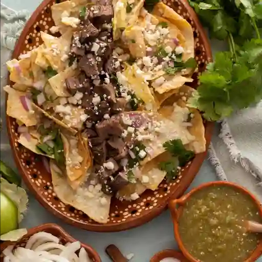 Crujientes totopos bañados en salsa roja o verde, servidos con bistec jugoso a la plancha, crema, queso fresco y cebolla morada. un clásico mexicano lleno de sabor, ideal para disfrutar en cualquier momento del día.