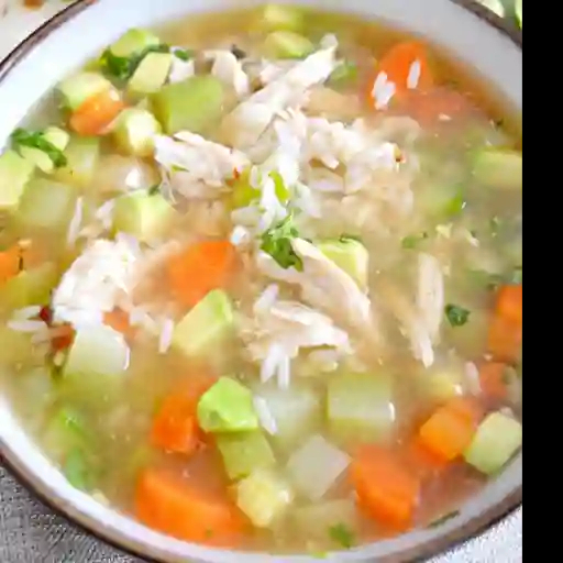 Consomé con arroz (1 litro) con verduras, pechuga deshebrada o pollo por pieza, con agua de 1/2 litro.