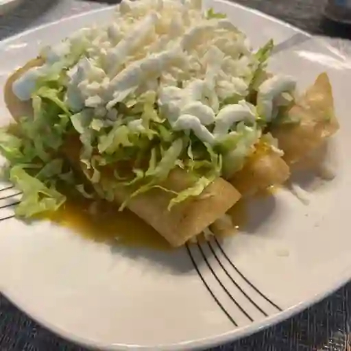 Te incluye: sopa, arroz, frijoles, tacos dorados acompañados de lechuga, crema, queso, jitomate, agua y gelatina.