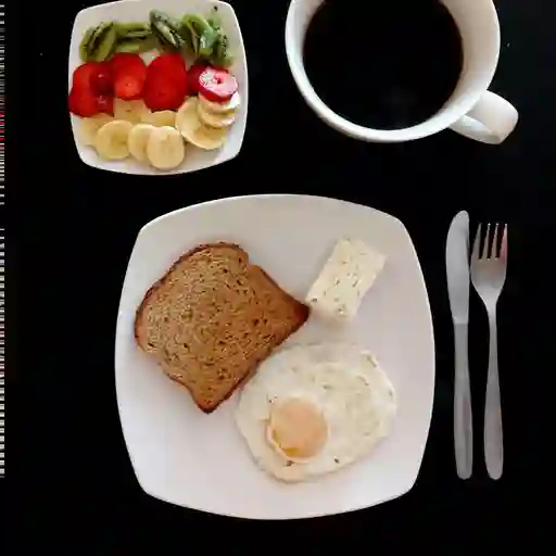 Un desayuno completo y nutritivo que comienza con huevos preparados al gusto, acompañados de una porción de fruta fresca de temporada que aporta frescura y energía. para complementar, una taza de café recién hecho, aromático y reconfortante, ideal para empezar el día con vitalidad.