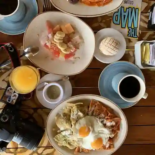 Un platillo típico y lleno de sabor: chilaquiles bañados en salsa roja o verde, coronados con pollo deshebrado, crema, queso fresco y un toque de cebolla morada. acompañados de fruta fresca de temporada, que aporta equilibrio y frescura, y una taza de café aromático para empezar la mañana.