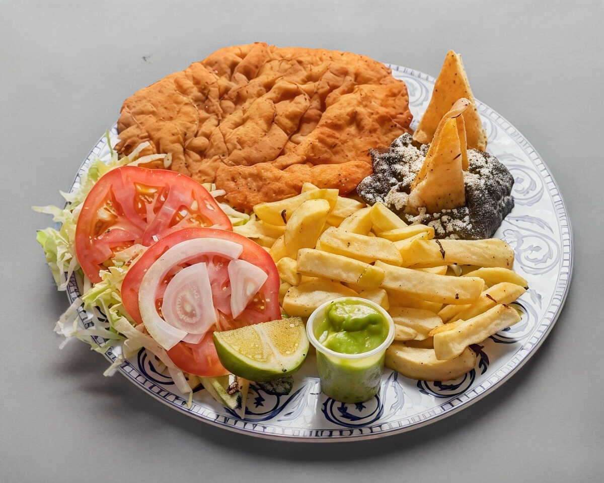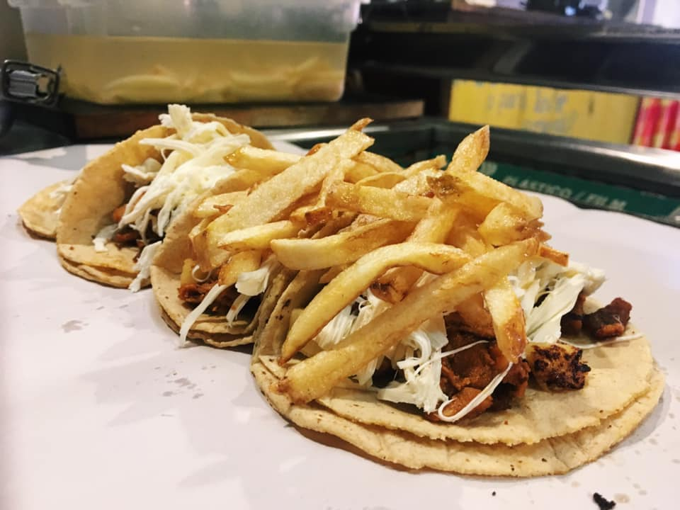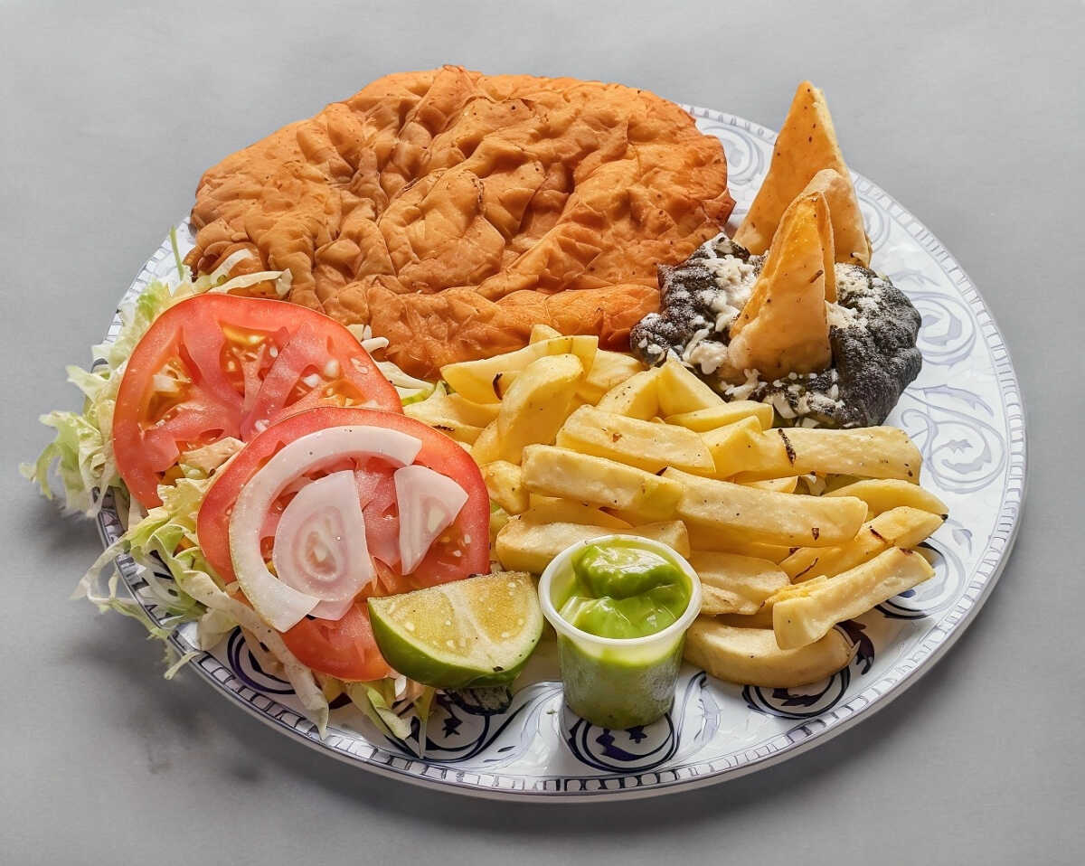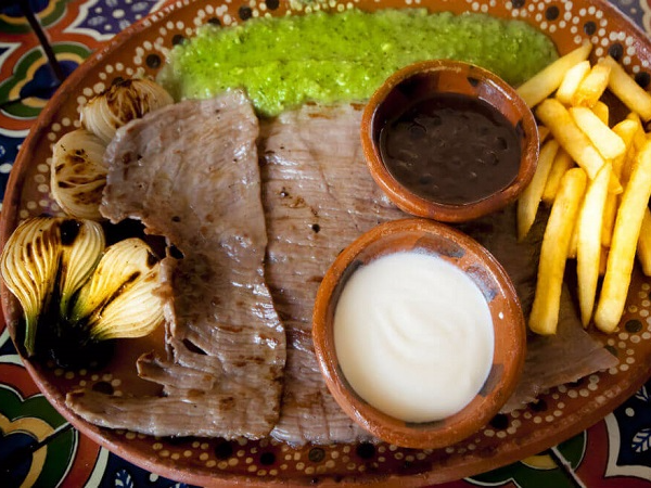 Con doble tortilla grande, papas a la francesa, frijoles, nopales, salsa y limón.