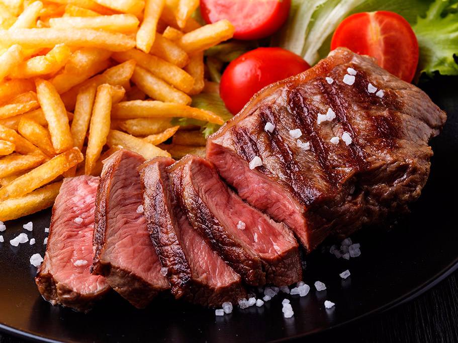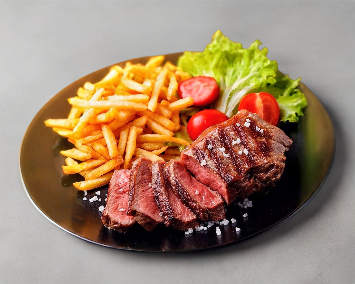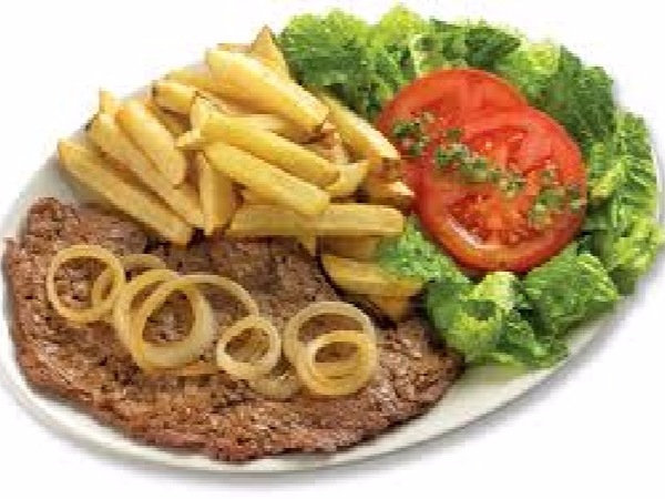 Bistec de res o pechuga asada en la plancha con ensalada de lechuga, cebolla, jitomate, salsa, frijoles refritos con queso y totopos y papas a la francesa, incluye tortillas o bolillo