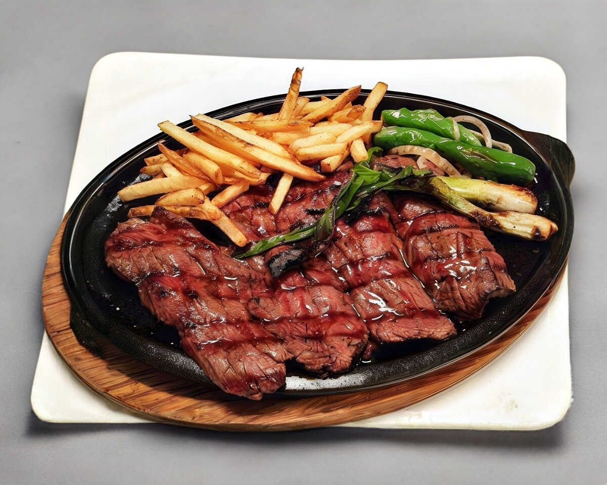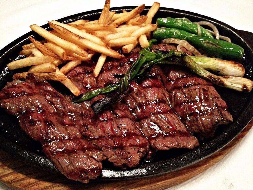 Corte new york de 200 gramos pesados antes de la cocción, marinado con una combinación especial de la casa, acompañado de cebollitas de cambray y nopales a la plancha, chiles toreados, frijoles refritos con queso y totopos, queso blanco a la plancha, papas a la francesa, salsa y tortillas.