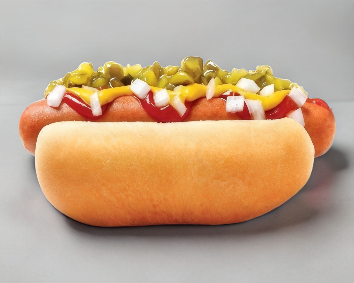 En un pan ligeramente tostado con una salchicha horneada con cebolla, rajas y jitomate, incluye cátsup, mayonesa y mostaza.