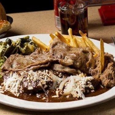 Bistec de res a la plancha con arroz, frijoles con totopos, 2 enchiladas de mole, papas a la francesa, salsa, limón y tortillas