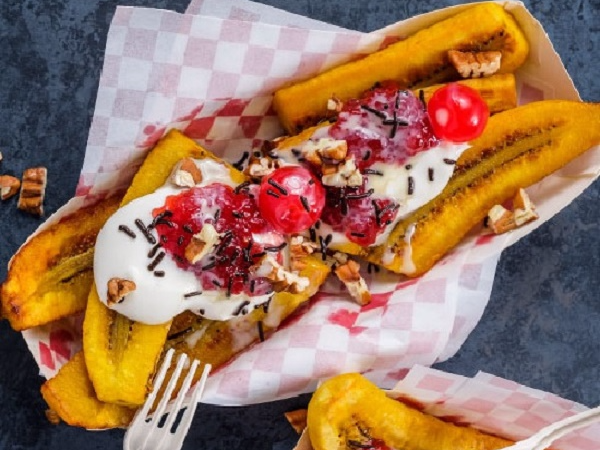 Plátanos machos fritos en su punto acompañados de 3 ingredientes a elegir.