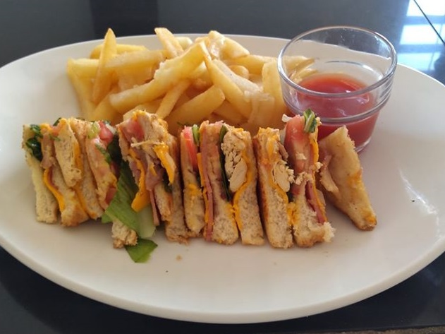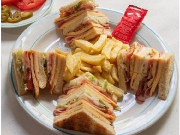 3 panes ligeramente tostados con lechuga, jamón, pechuga de pollo, tocino, queso amarillo, queso manchego, jitomate, cebolla y rajas, incluye papas a la francesa