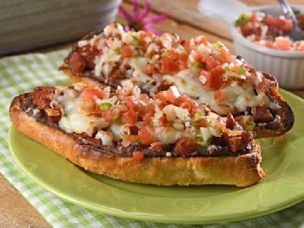 Horneados con frijoles y queso manchego bien gratinado, incluyen rajas o pico de gallo.