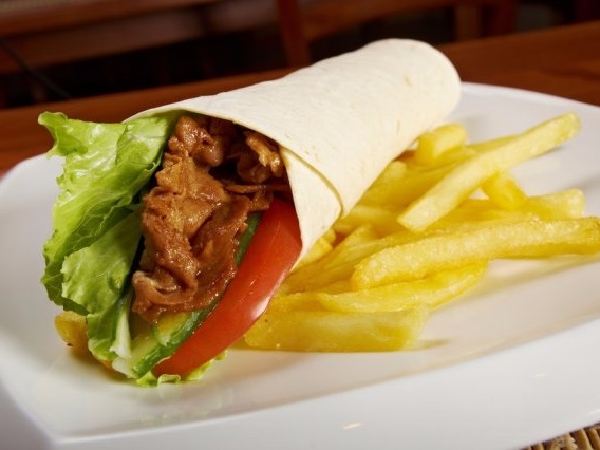 Burrito grande de bistec de pollo con frijoles, cebolla, pimiento, queso oaxaca y aderezo, acompañado con papas a la francesa, salsa y ensalada de lechuga.