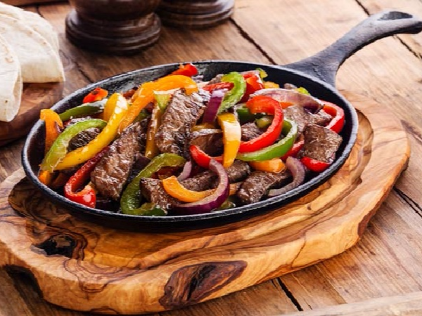 200 gr de arrachera, 200 gr de bistec, 200 gr de pollo, 200 gr de longaniza y 200 gr de cecina con cebollitas, nopales, chiles toreados, frijoles refritos, queso a la plancha, papas a la francesa, salsa y tortillas