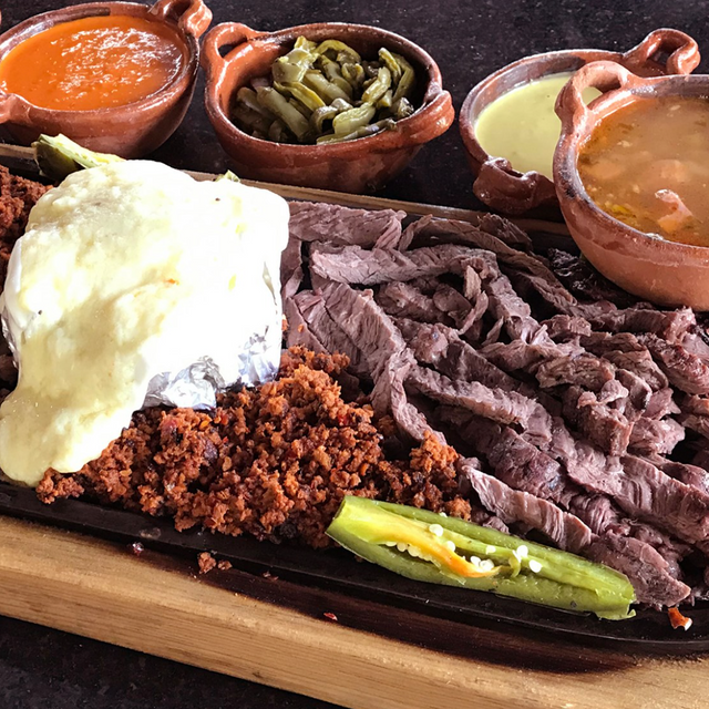 100 gr de arrachera, 100 gr de bistec, 100 gr de pollo, 100 gr de longaniza y 100 gr de cecina con cebollitas, nopales, chiles toreados, frijoles refritos, queso a la plancha, papas a la francesa, salsa y tortillas