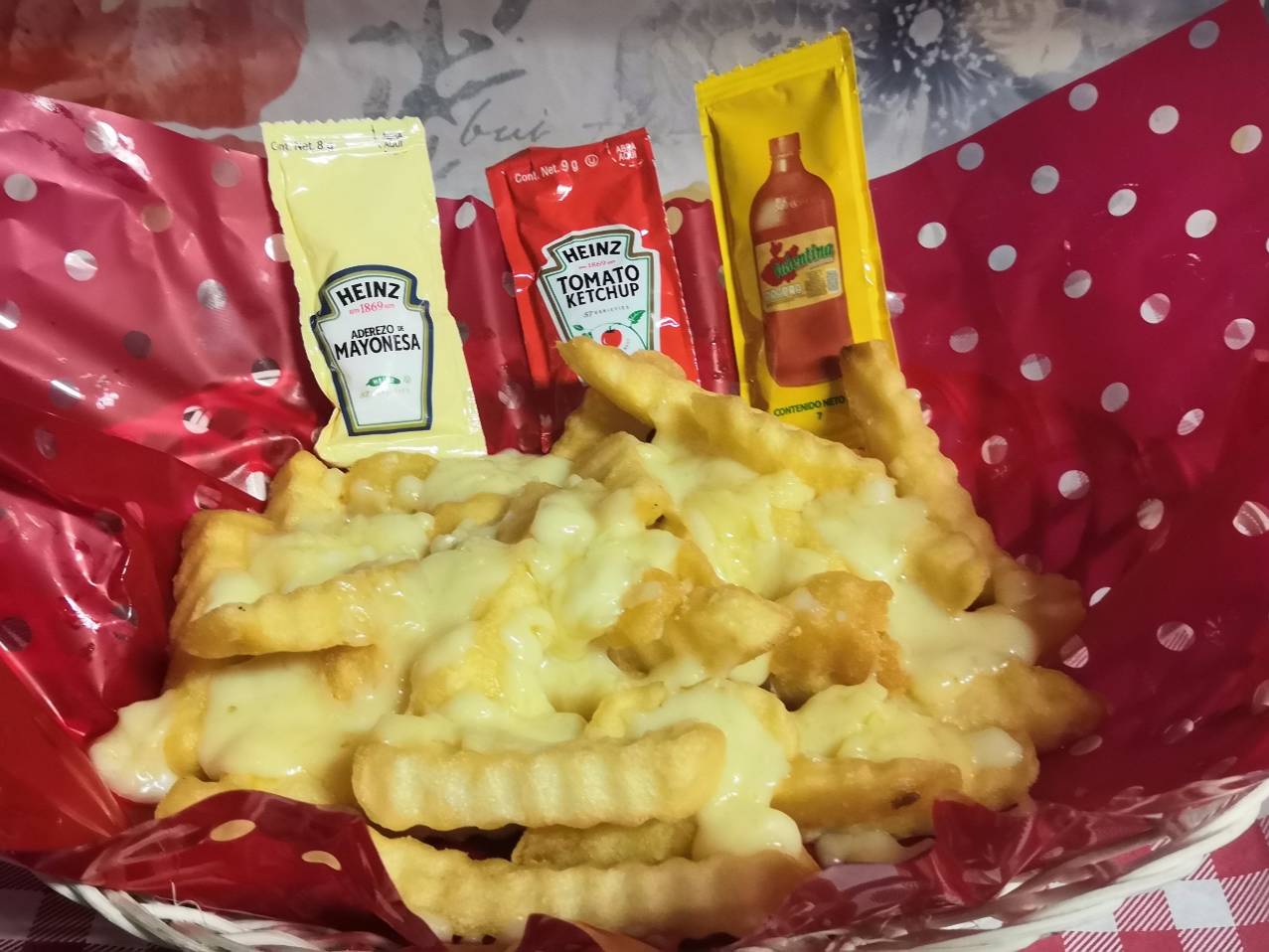 Papas de naturales gratinadas con queso amarillo acompañadas de cátsup y valentina
