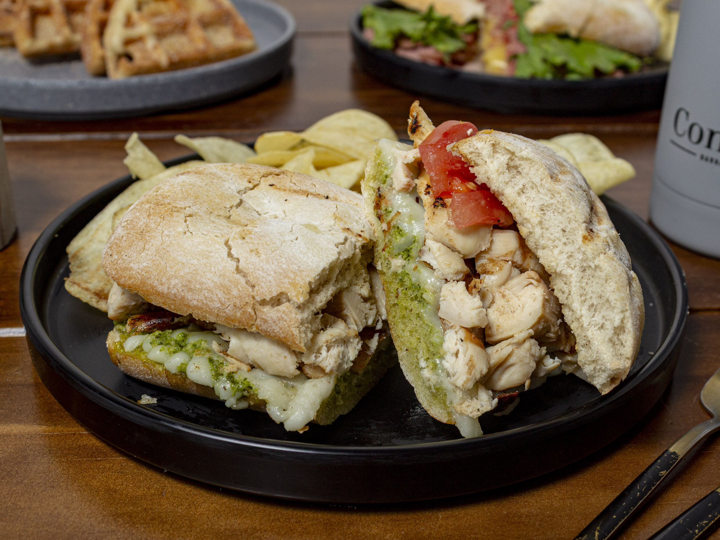 "Chapata de pollo a la planca, pesto, queso mozzarella y tomates"