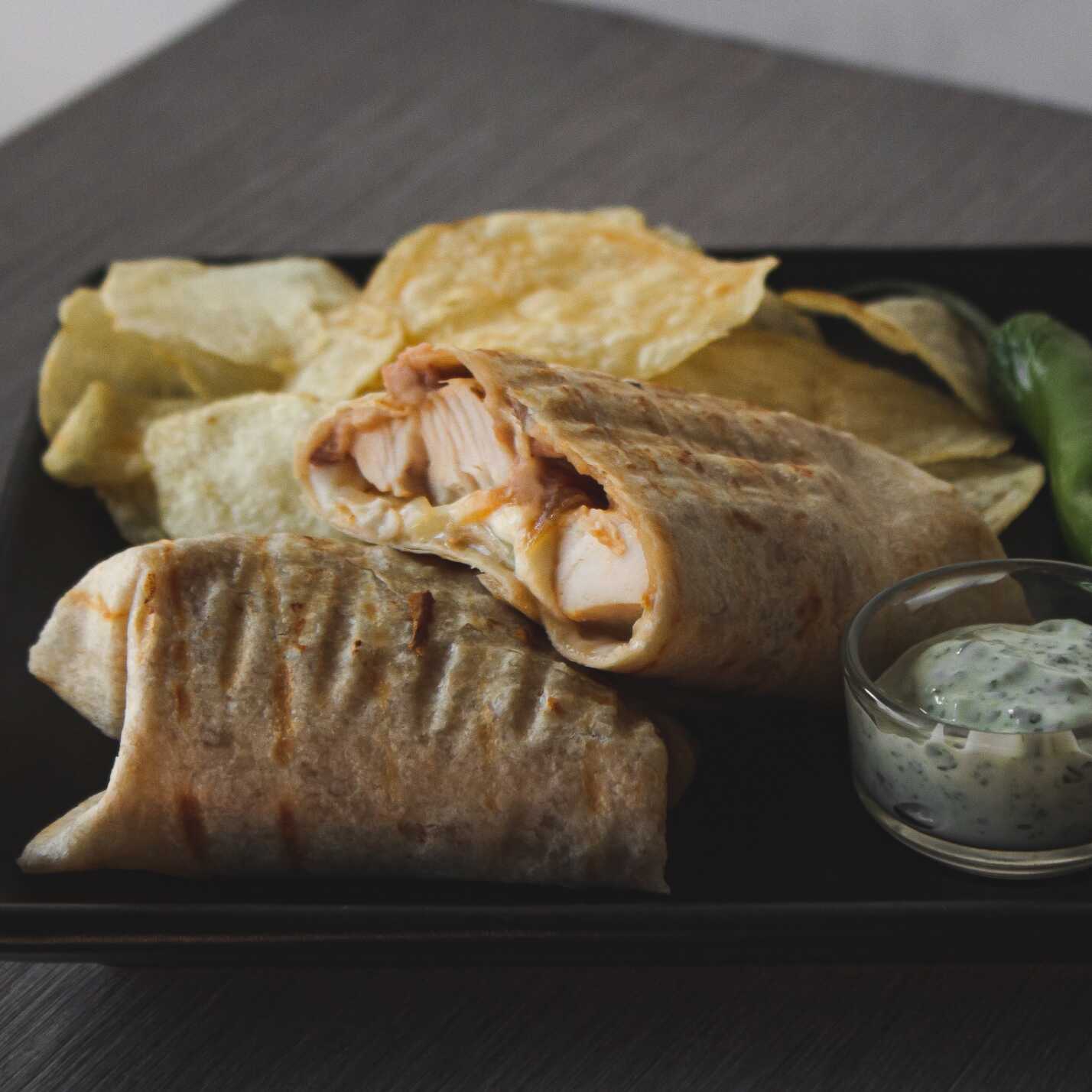 “Exquisito burrito preparado con pollo sazonado, mantequilla, pepino, arándanos, cebolla caramelizada y acompañado con papa".