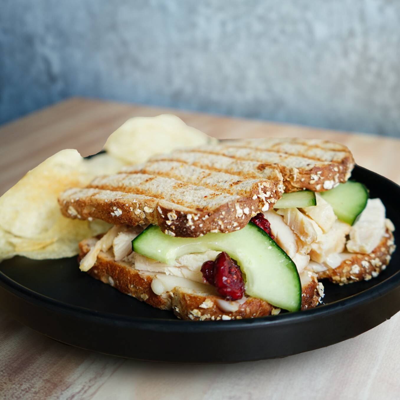 “Exquisito sándwich preparado con pollo sazonado, mantequilla, pepino, aderezo estilo tzatziki, arándanos, cebolla caramelizada y acompañado con papa.