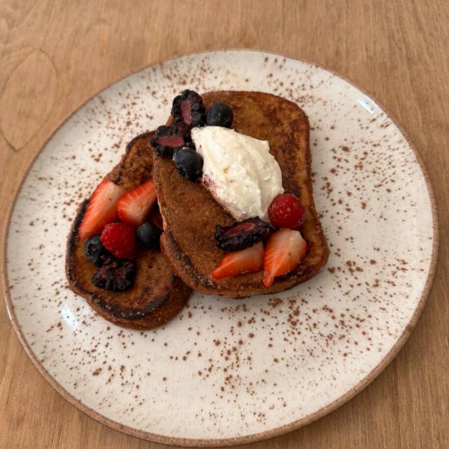 Dos rebanadas de pan brioche embebido con jarabe de café, servido con cremoso de mascarpone, cocoa y de frutos rojos de temporada.
