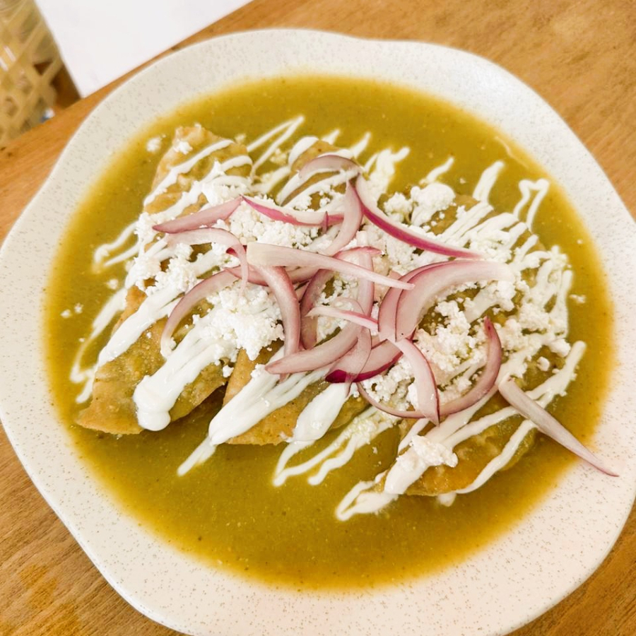 Tres piezas de tortillas, rellenas de pollo cocido, bañadas con salsa a Elegir: Verde o Roja. Acompañadas con crema, queso doble crema y juliana de cebolla morada.