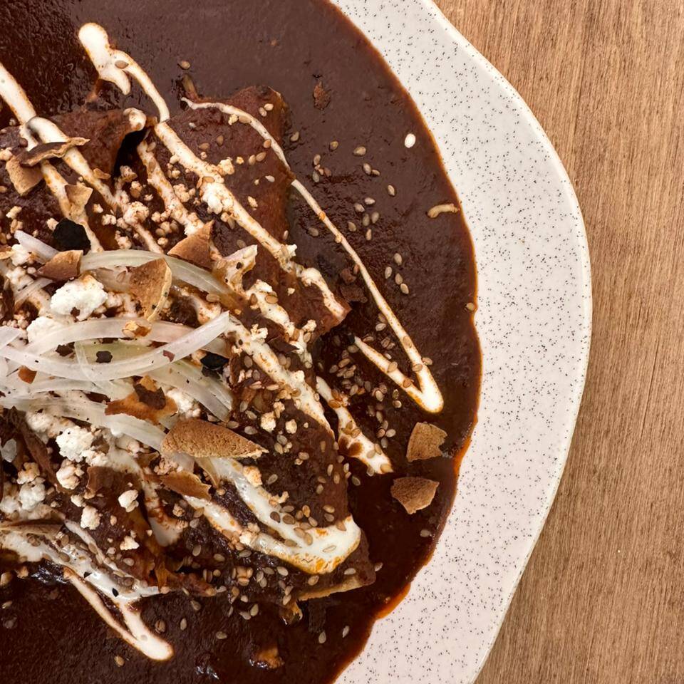 Tres piezas de tortilla rellenas de pollo deshebrado, bañadas en mole Veracruzano, servidas con crema, queso doble crema, ajonjolí tostado, cebolla morada y ceniza de tortilla.