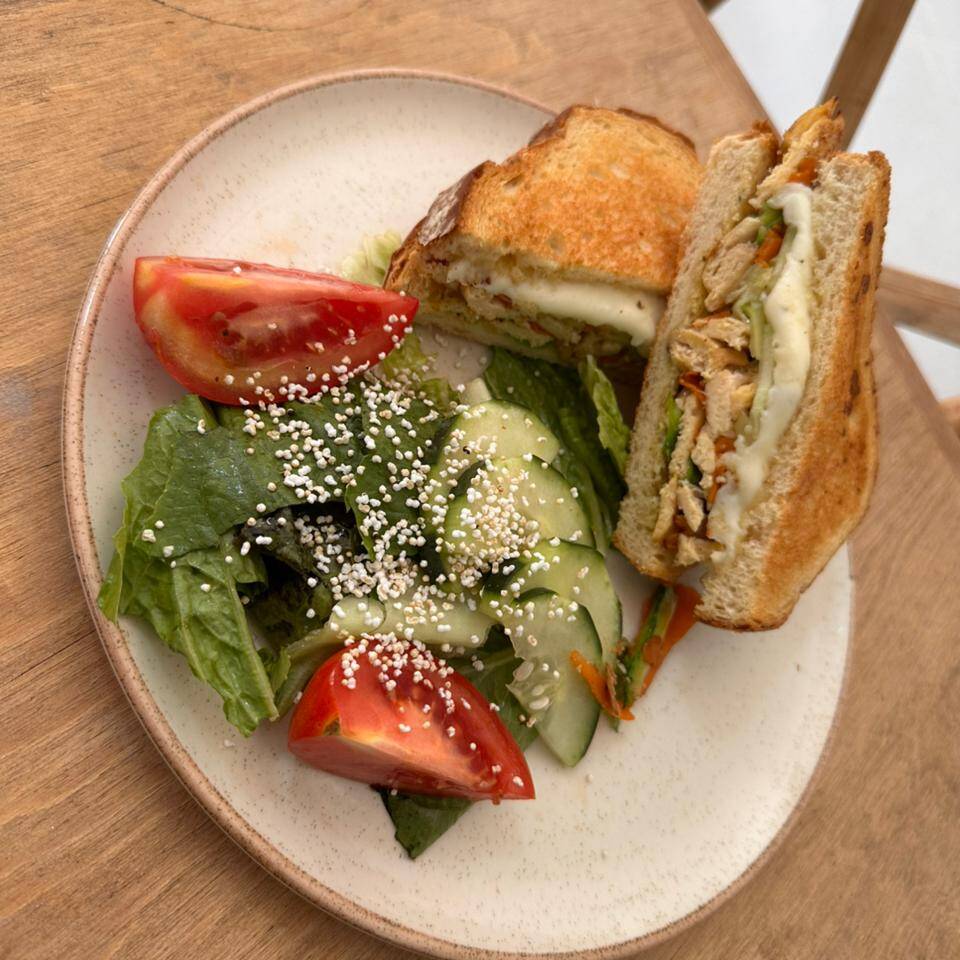 Pan de caja dorado con mantequilla y aderezo de cilantro, servido con pollo asado, espinaca, pepino, zanahoria y calabaza blanqueada, gratinado con queso mozzarella, acompañado con guarnición a elegir entre papas a la francesa o ensalada.