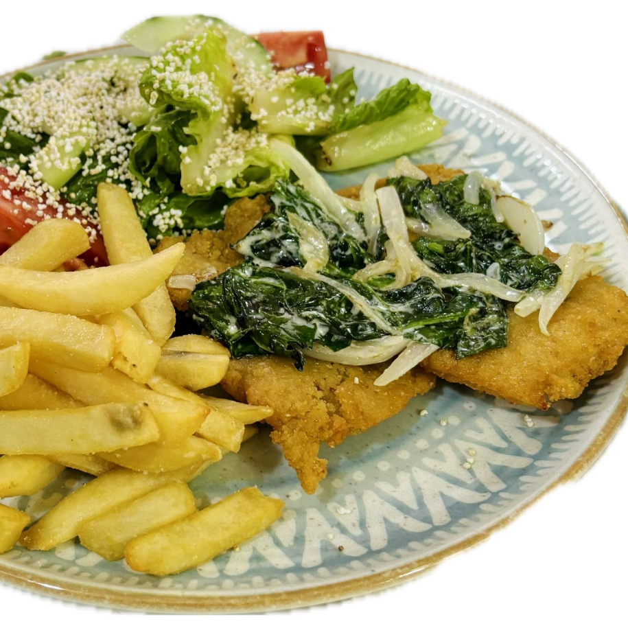 Milanesa de pollo o res, acompañada de espinacas a la crema y queso parmesano, con guarnición de ensalada y papas a la francesa.
