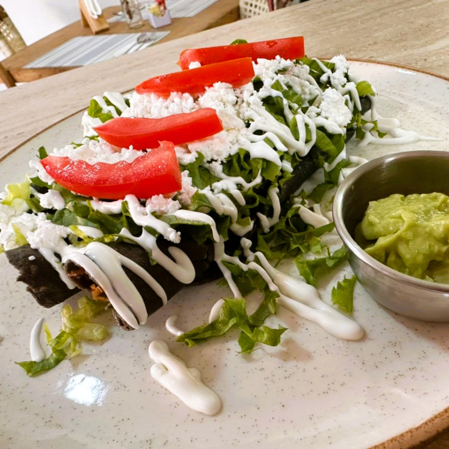 Tres tortillas rellenas, acompañadas de crema, queso doble crema, lechuga y guacamole. Opciones de Relleno: Pechuga de Pollo y Carne de Res.