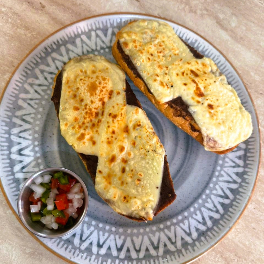 Bolillo tostado, con mantequilla, frijoles negros y queso manchego gratinado. Acompañado de pico de gallo