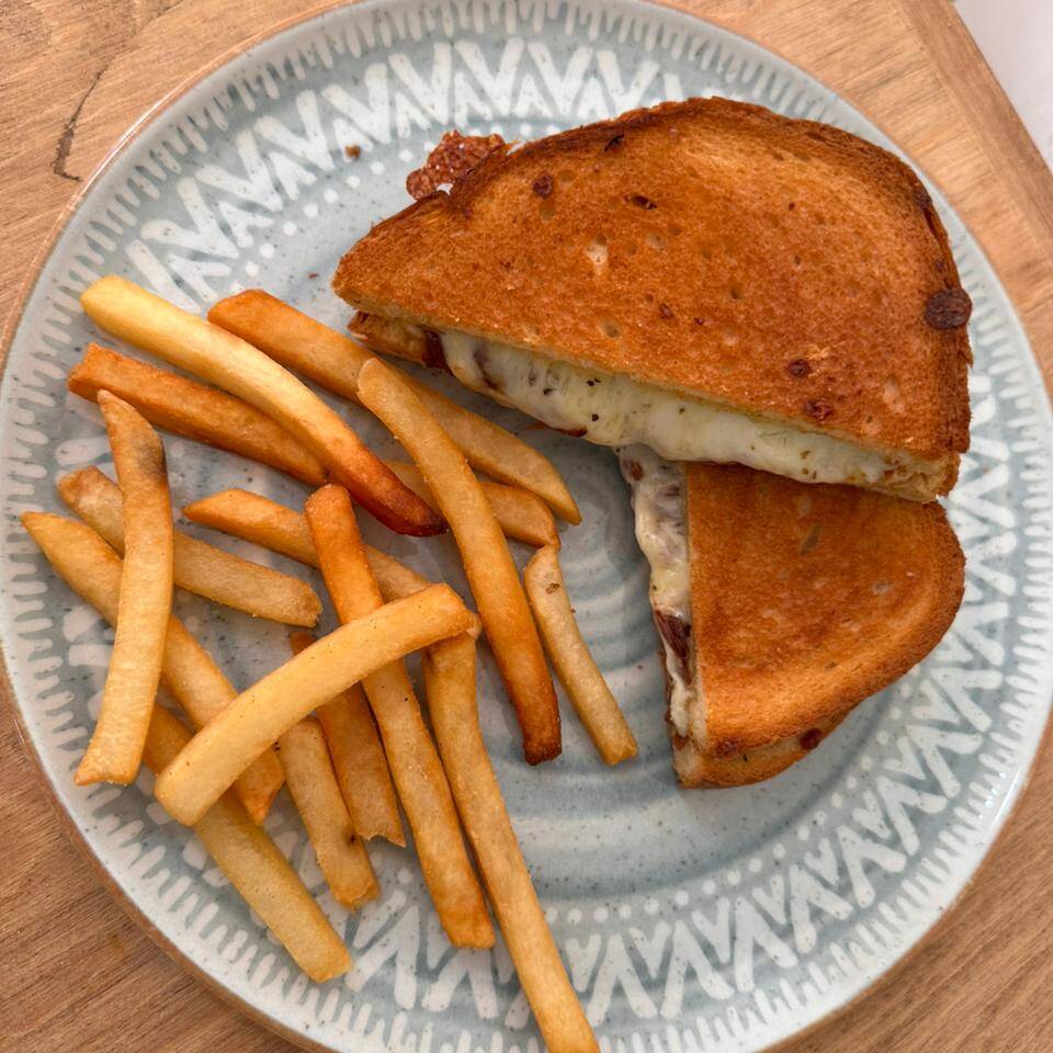 Dos panes dorados con mantequilla, gratinados con mix de queso (cheddar, mozzarella y manchego), cebolla caramelizada al vino tinto y guarnición a elegir entre papas a la francesa o ensalada.