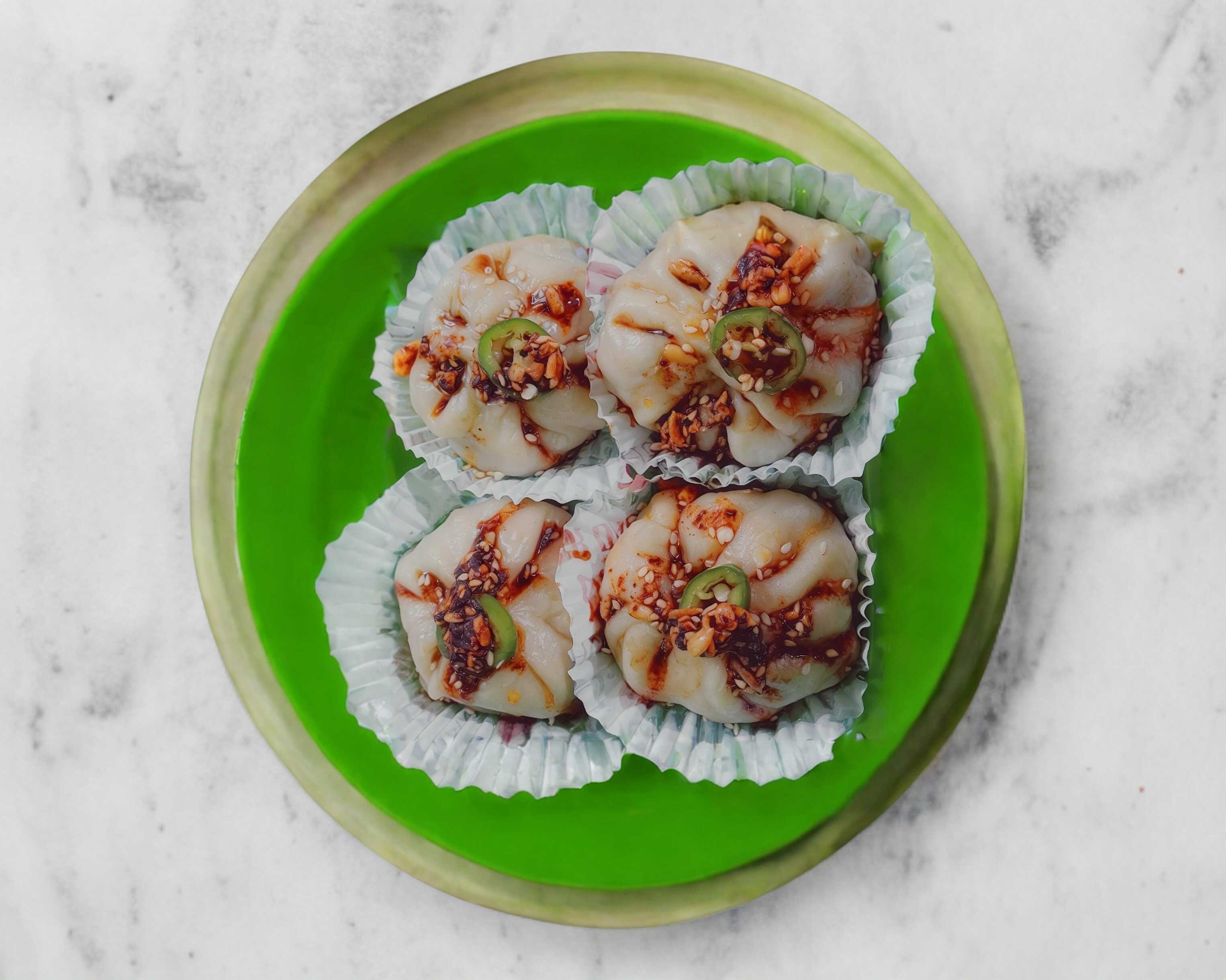 Dumplings rellenos de carne de res con salsa macha y salsa de soya por separados.