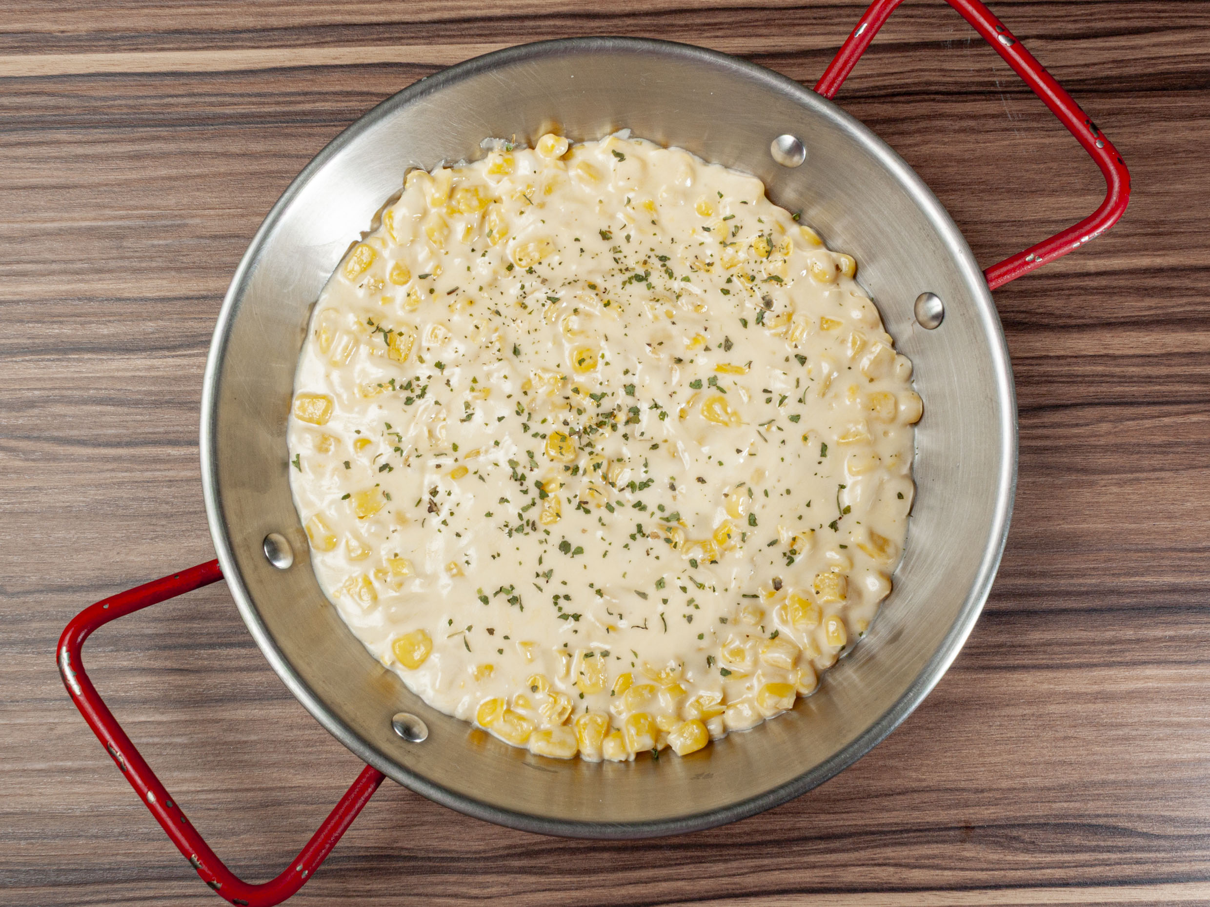 Elote dulce con mezcla de quesos (monterrey jack, menonita y gouda) y cebollín.