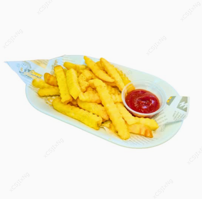 Banderilla de salchicha de res con empanizado coreano y papas en cubo.