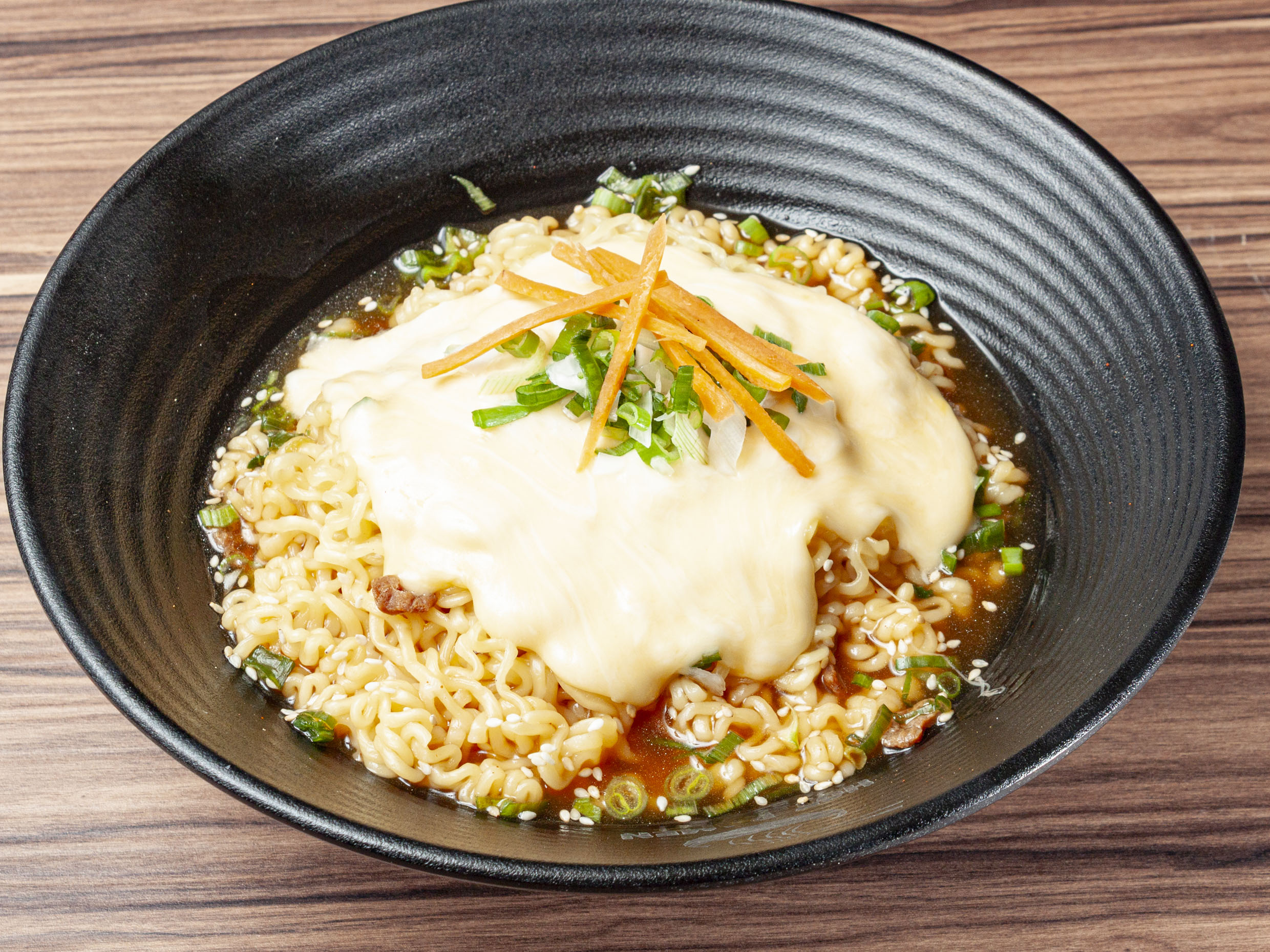 Elote dulce con mezcla de quesos (monterrey jack, menonita y gouda), acompañado de un ramen buldak encima, grado picante medio y cebollín.