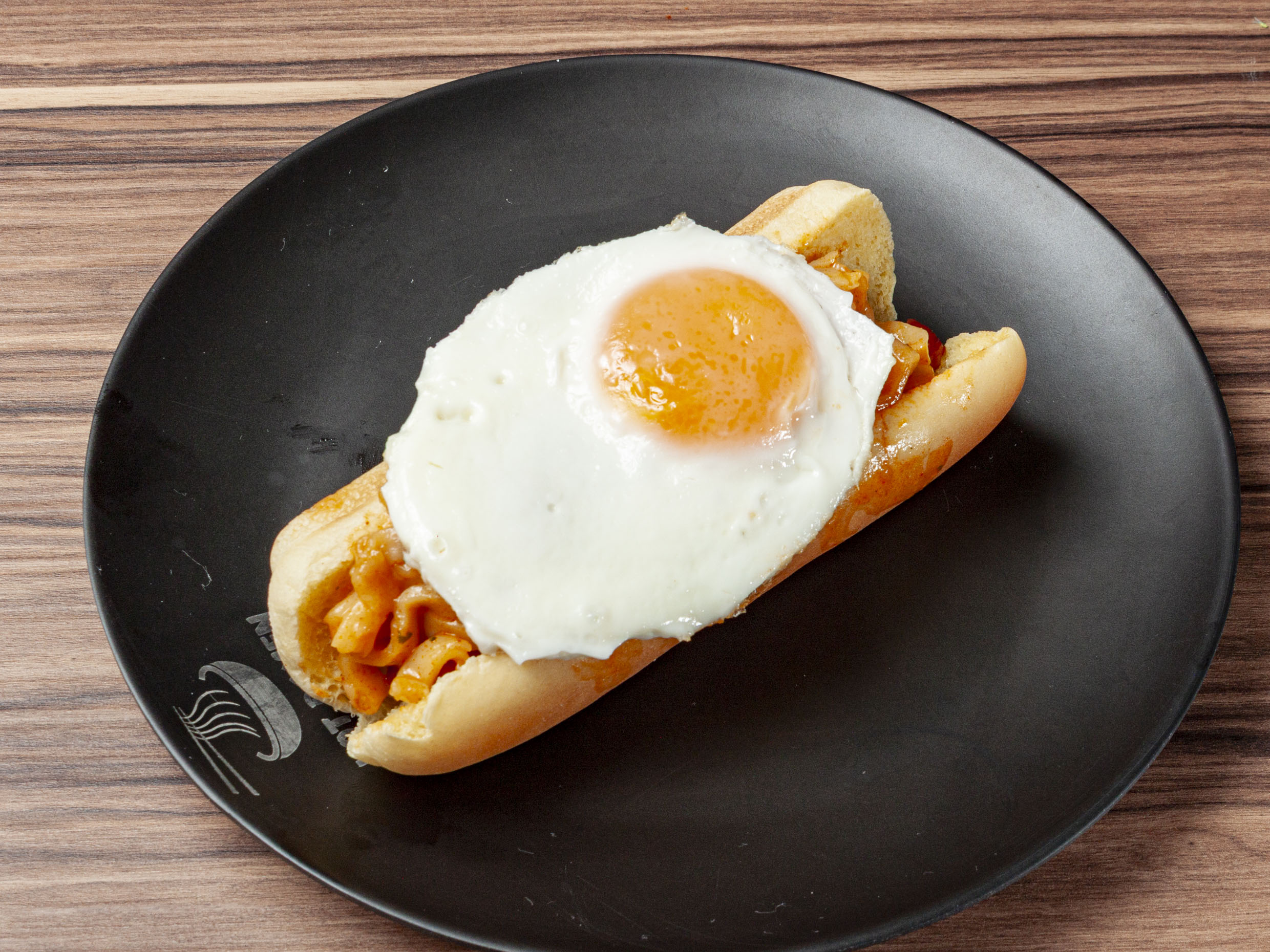 Hot dog coreano con pan tipo brioche, salchicha de res y ramen buldak y huevo estrellado encima.