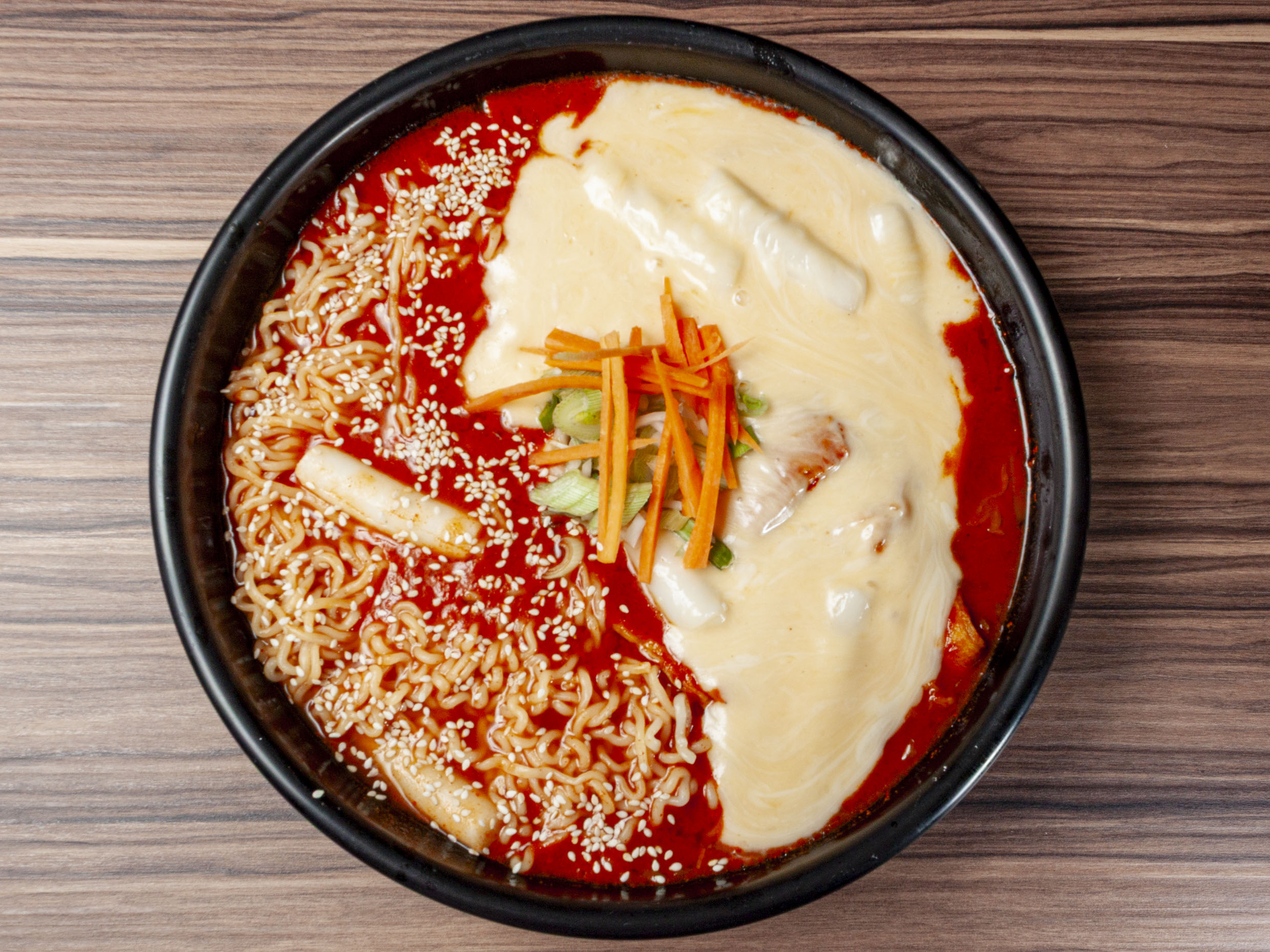 Fideos de ramen con pasteles de arroz (tteokbokki) y una salsa especial poco picante.