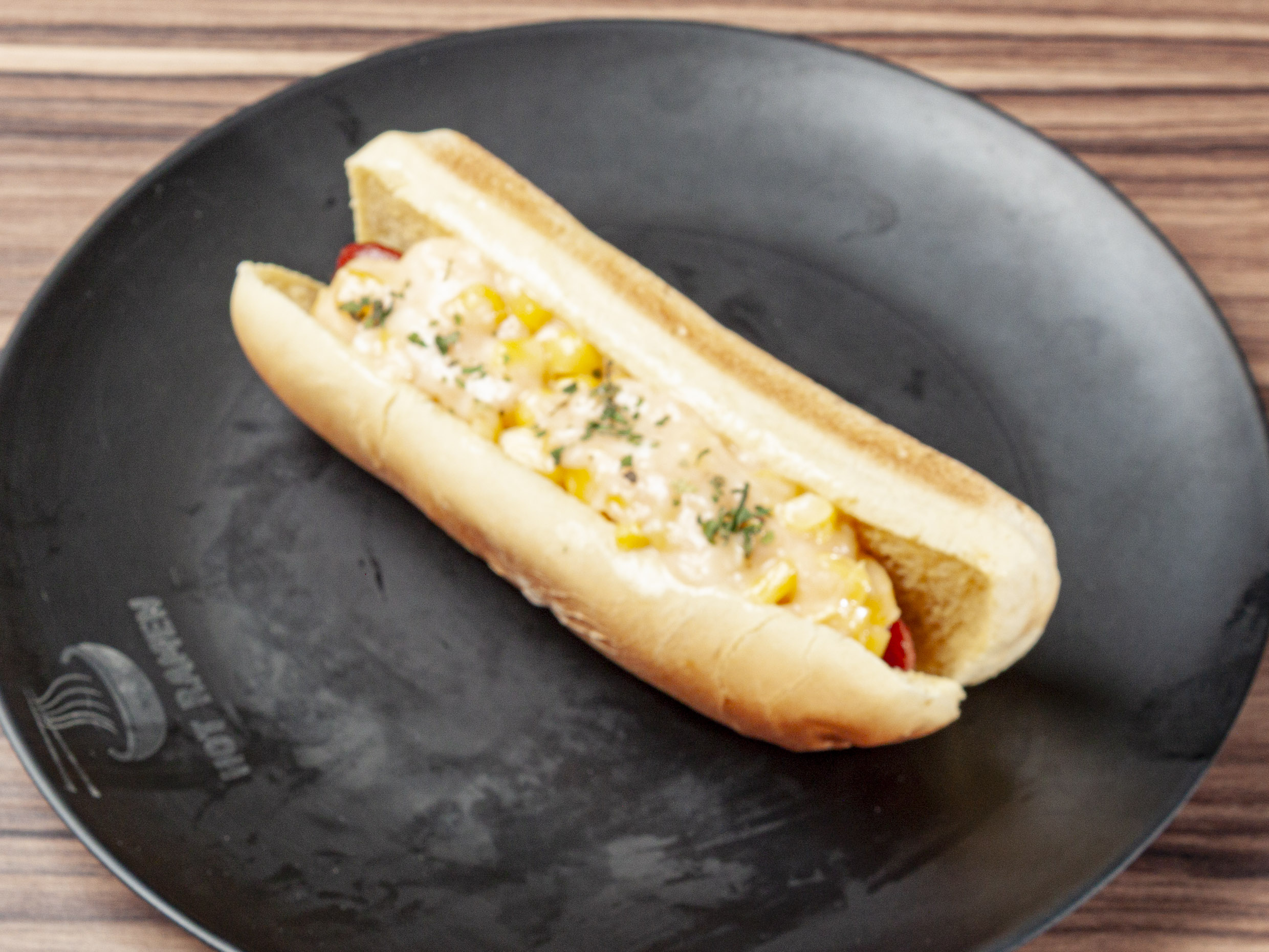 Hot dog coreano con pan tipo brioche, salchicha de res y elote dulce con queso por encima.