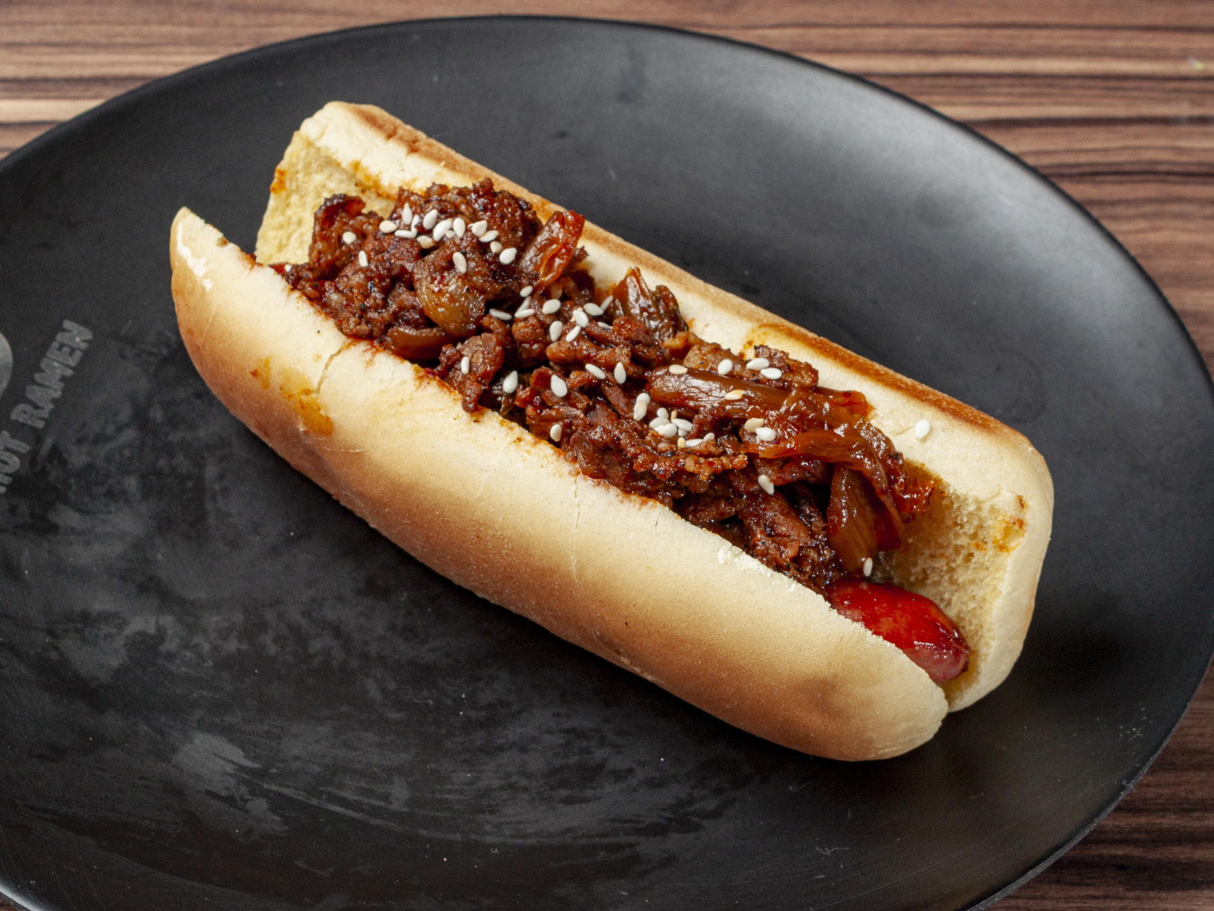 Hot dog coreano con pan tipo brioche, salchicha de res, tocino picante.