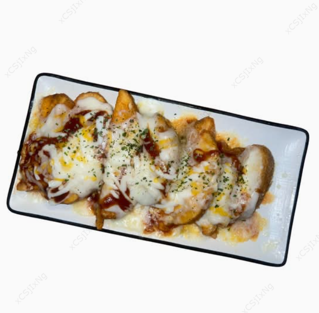Papas gajo (150 g), con queso gratinado, salsa BBQ y perejil.