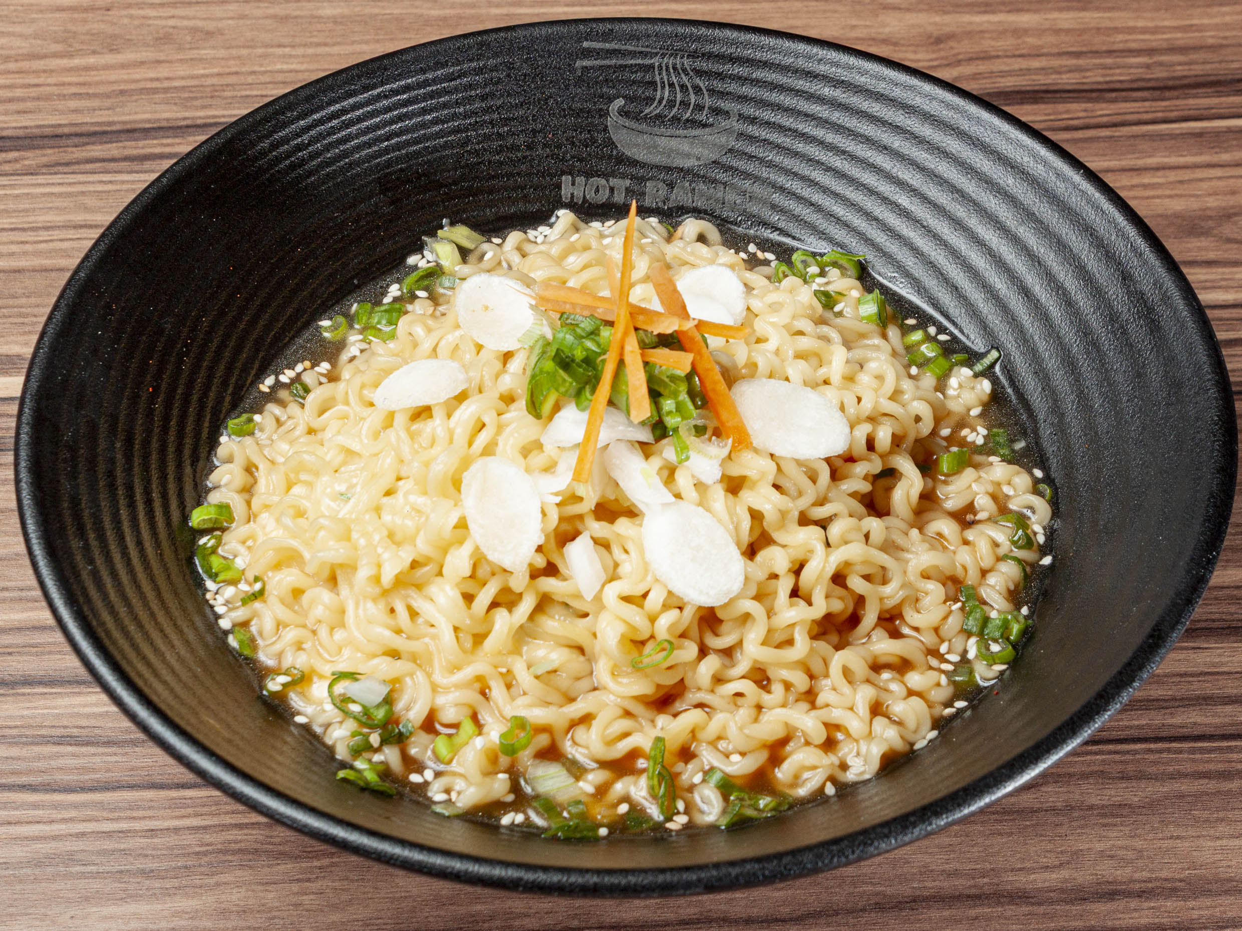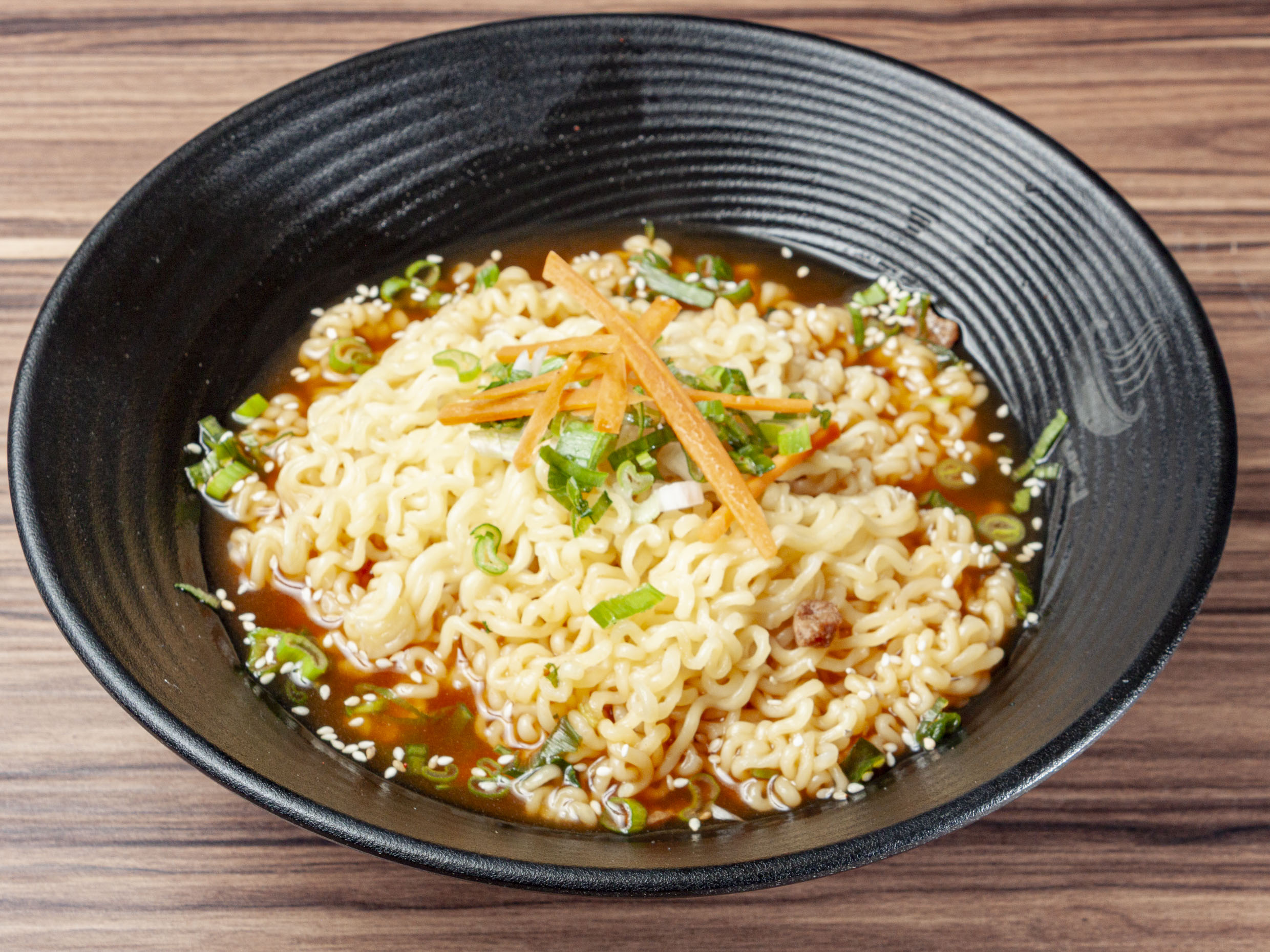 Fideo delgado de trigo con especias, alga nori y pasta de arroz, en caldo picante grado bajo.