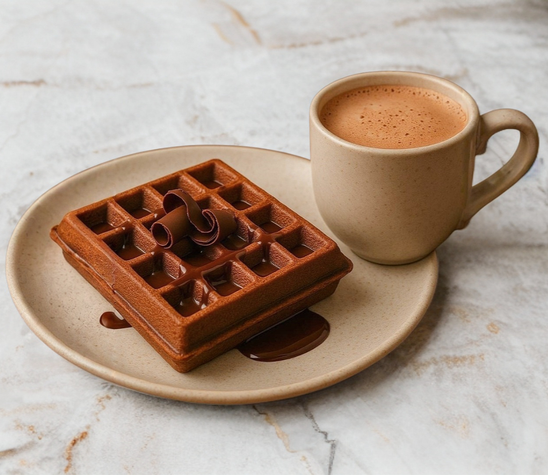 Delicioso wafffle de chocolate bañado con chocolate liquido, lechera y chispas de chocolate