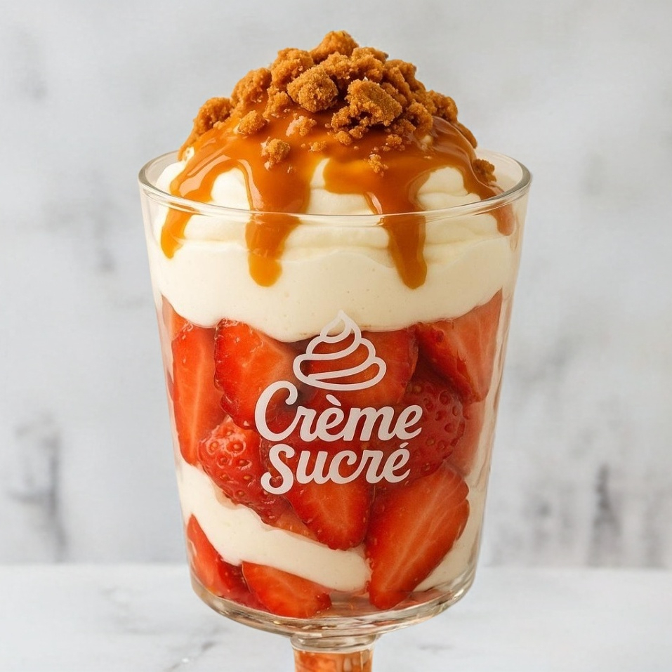 Trozos de Fresas frescas bañadas con crema suave, coronadas con un toque de caramelo y crujientes trozos de galleta Lotus que le dan el contraste perfecto entre dulce y crocante