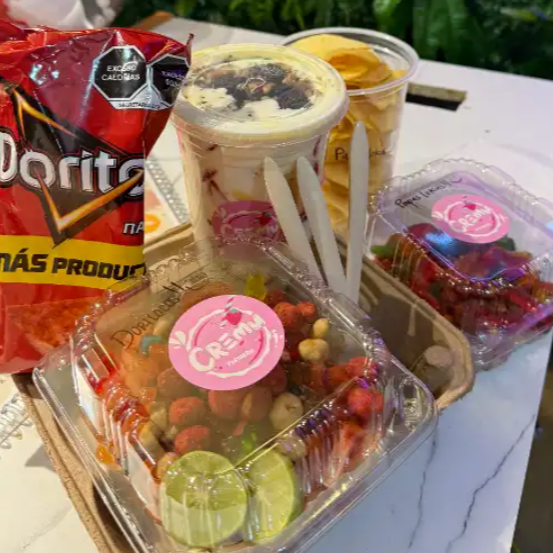 Doritos de tu elección con base de jícama, pepino, zanahoria, cacahuates, cueritos, gomitas, salsas, limón y sal.