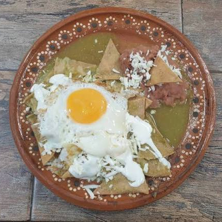 Chilaquiles verdes con pollo, acompañados de frijoles, queso, crema, aguacate y cebolla curtida.