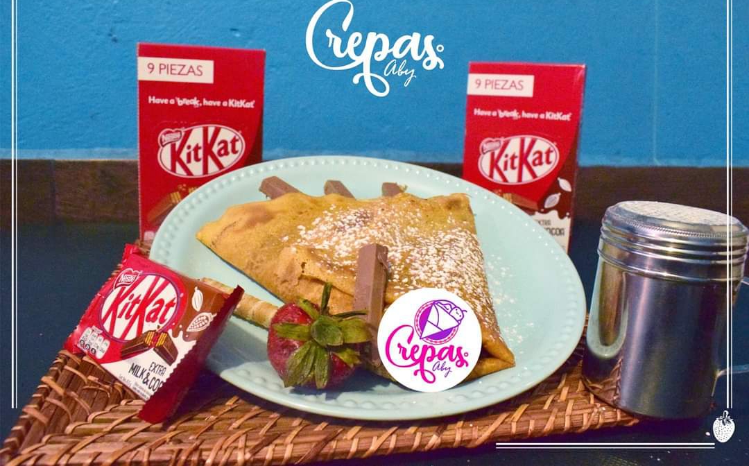 Crepa de Nutella con chocolate Kit Kat y fresa natural con topping y espolvoreado a tu elección.