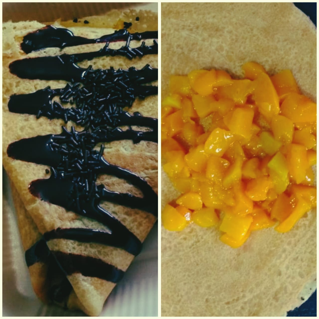 Crepa de hershey's y mango en almíbar con topping y espolvoreado a tu elección.