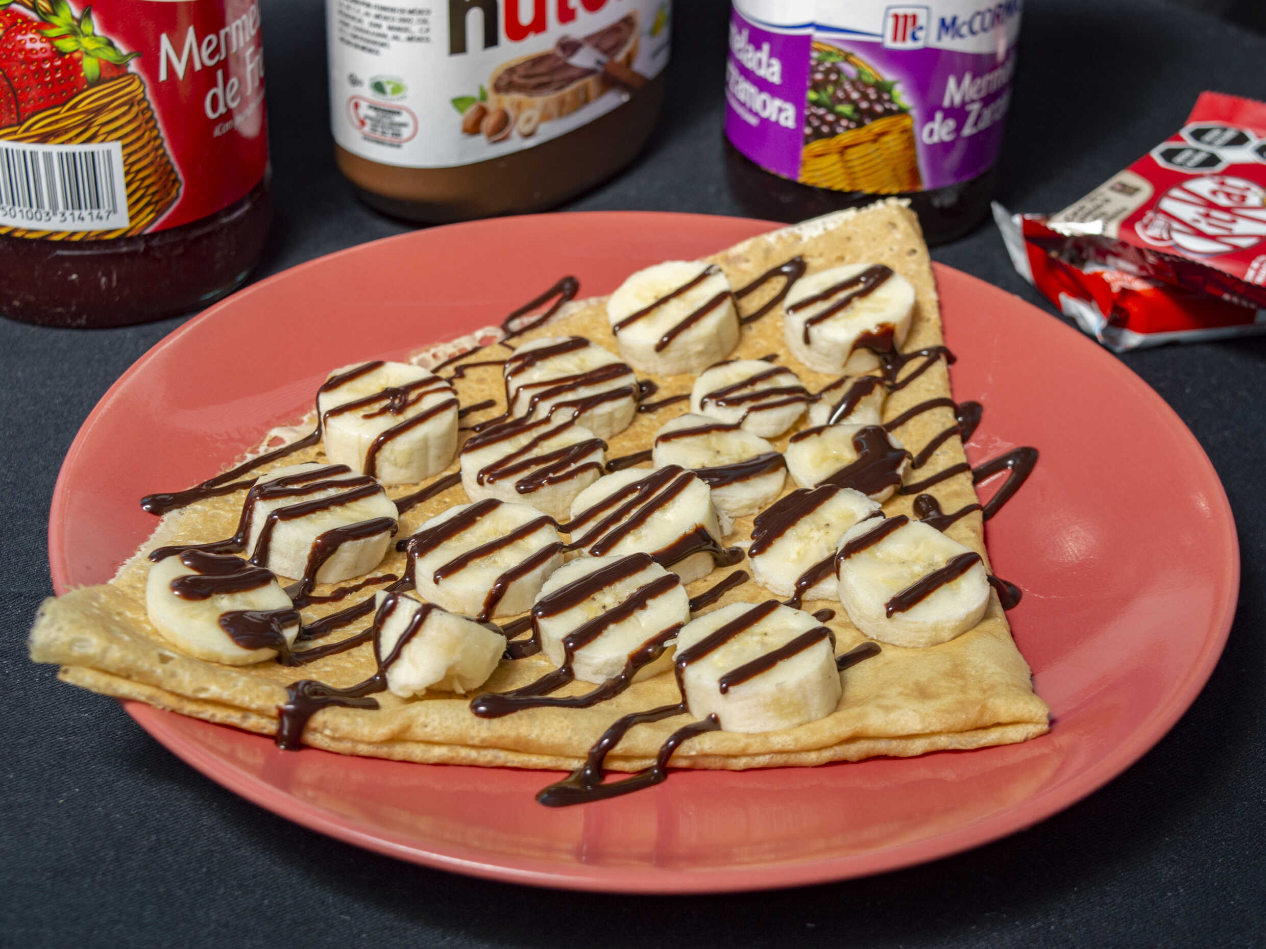 Crepa de jarabe de chocolate y plátano con topping y espolvoreado a tu elección.