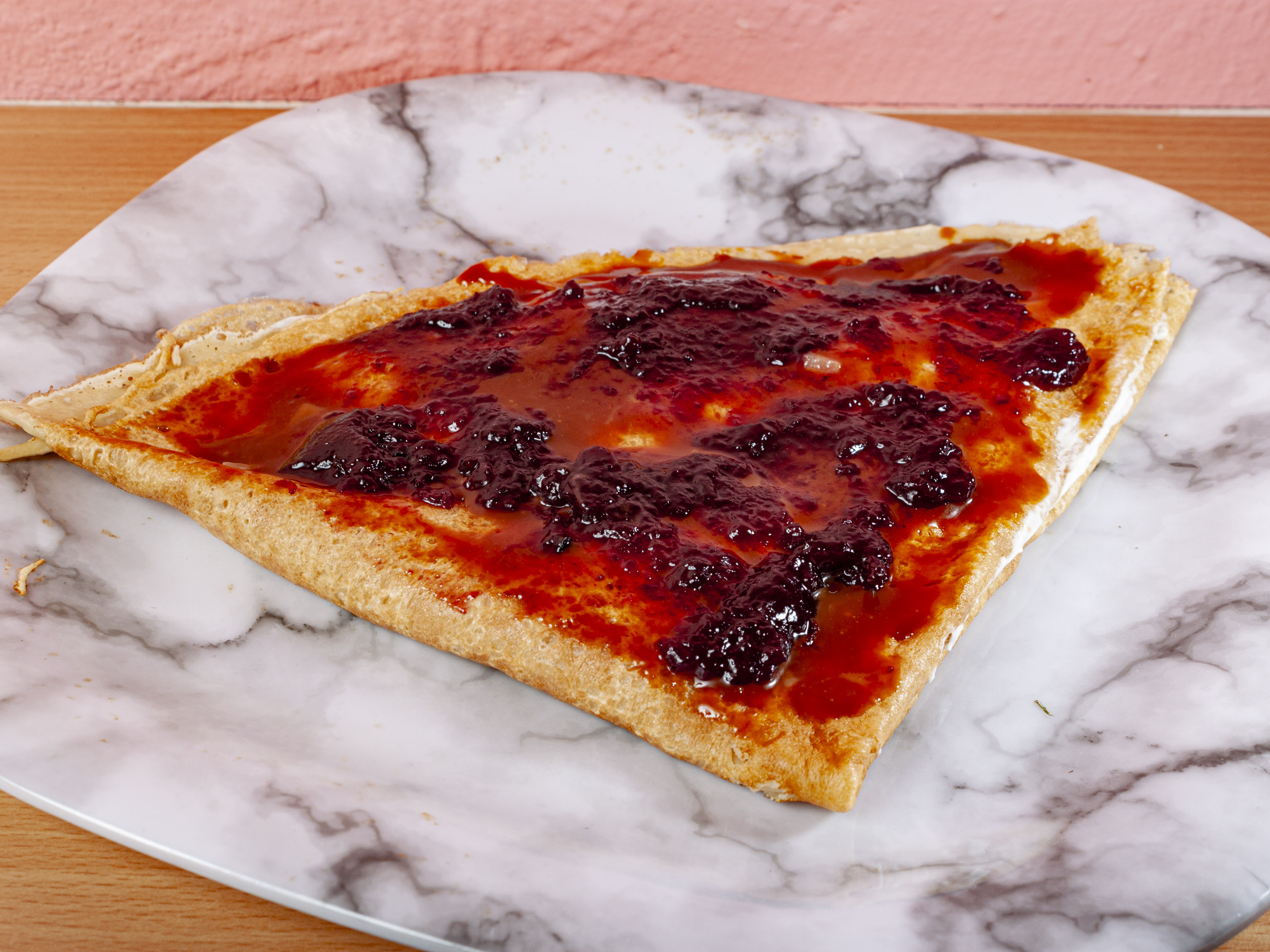 Crepa de dulce de leche y mermelada a elegir con topping y espolvoreado a tu elección.