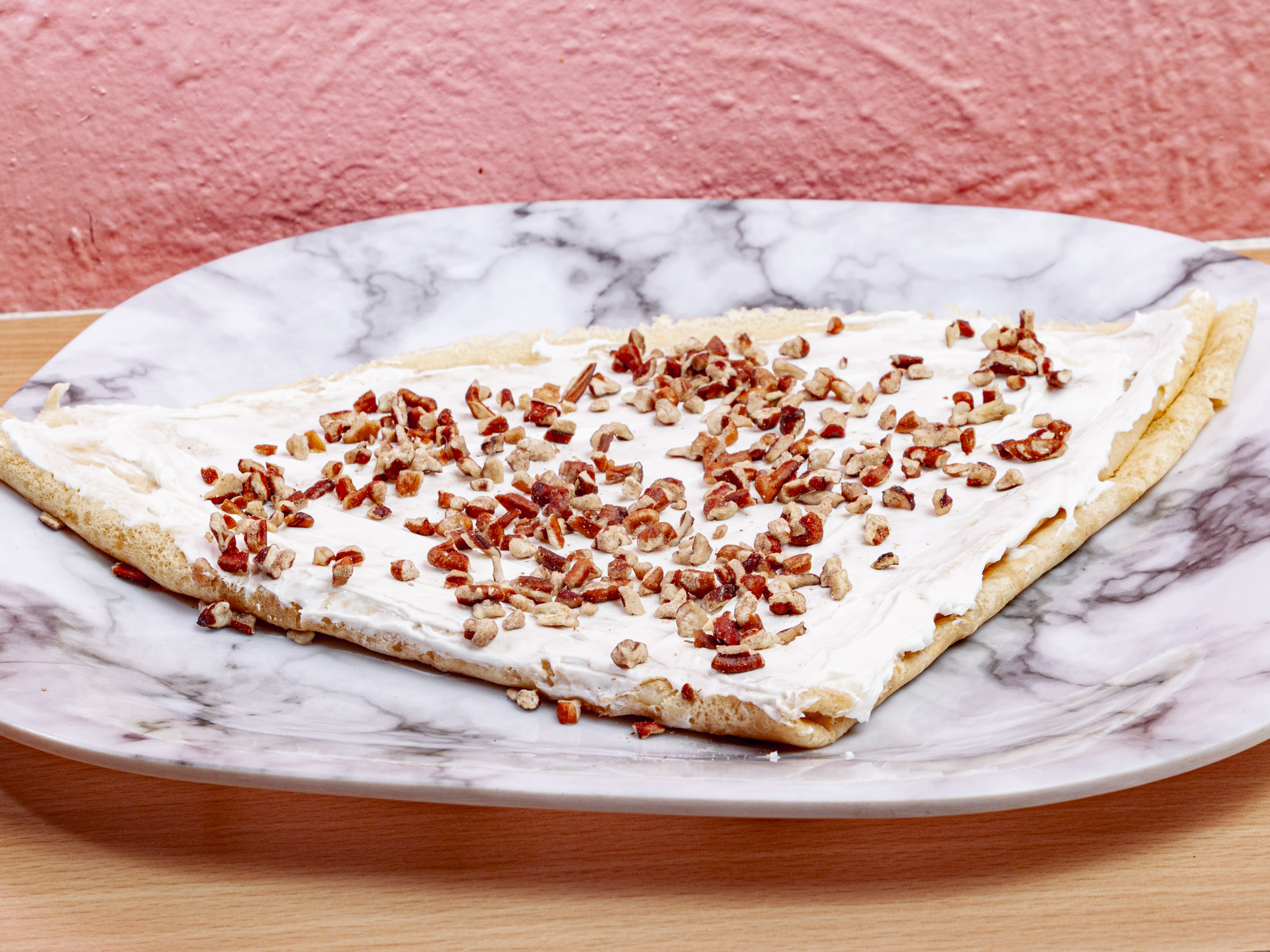 Crepa de queso Philadelphia y nuez con topping y espolvoreado a tu elección.