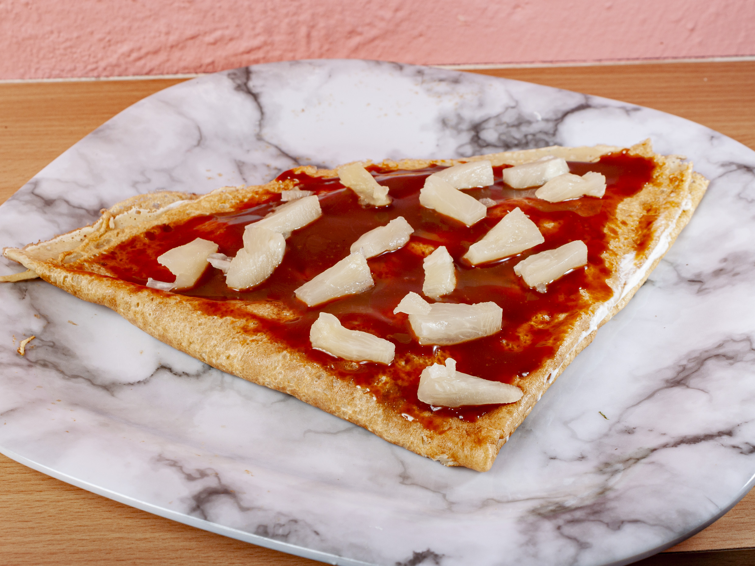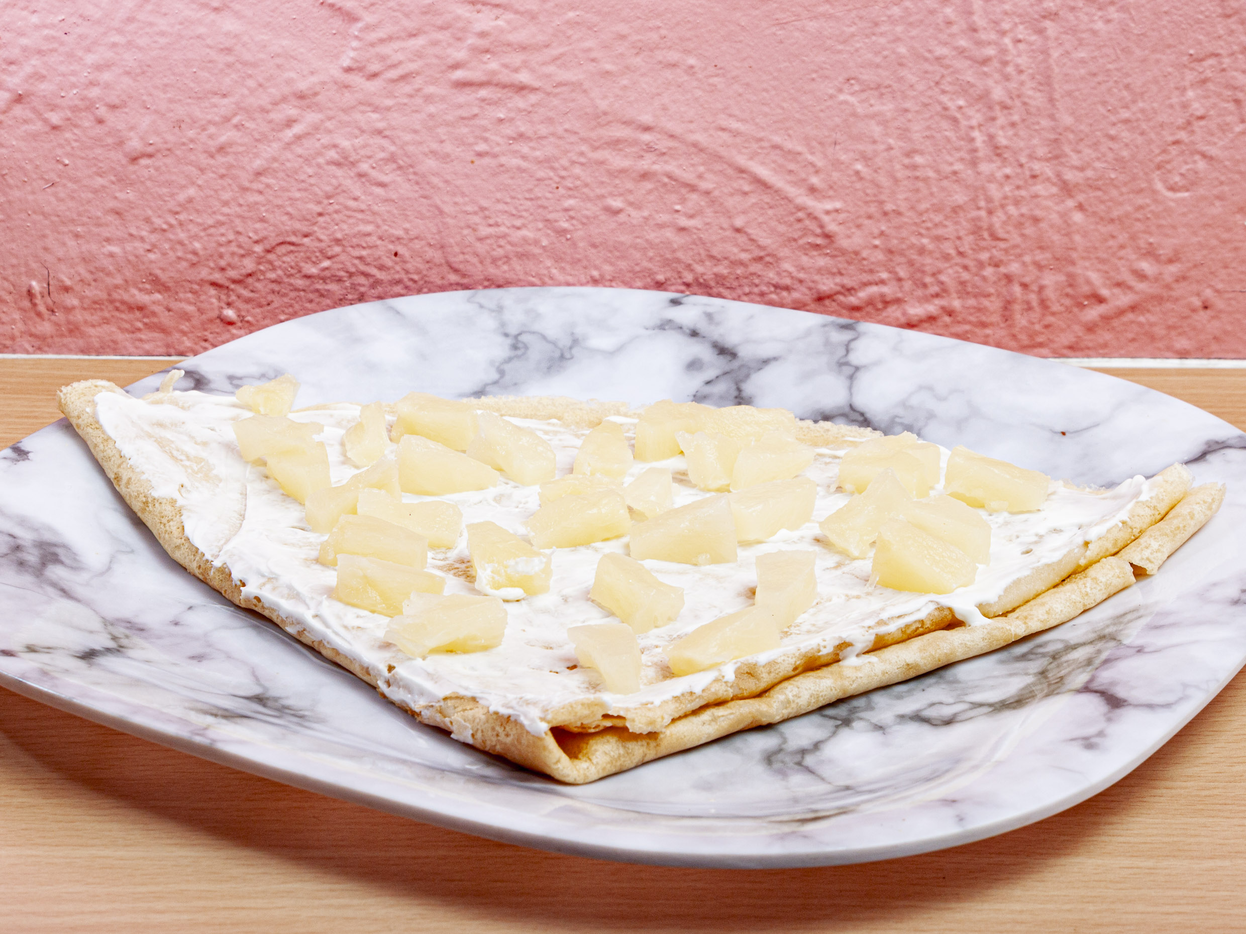 Crepa de dulce de leche y piña en almíbar con topping y espolvoreado a tu elección.